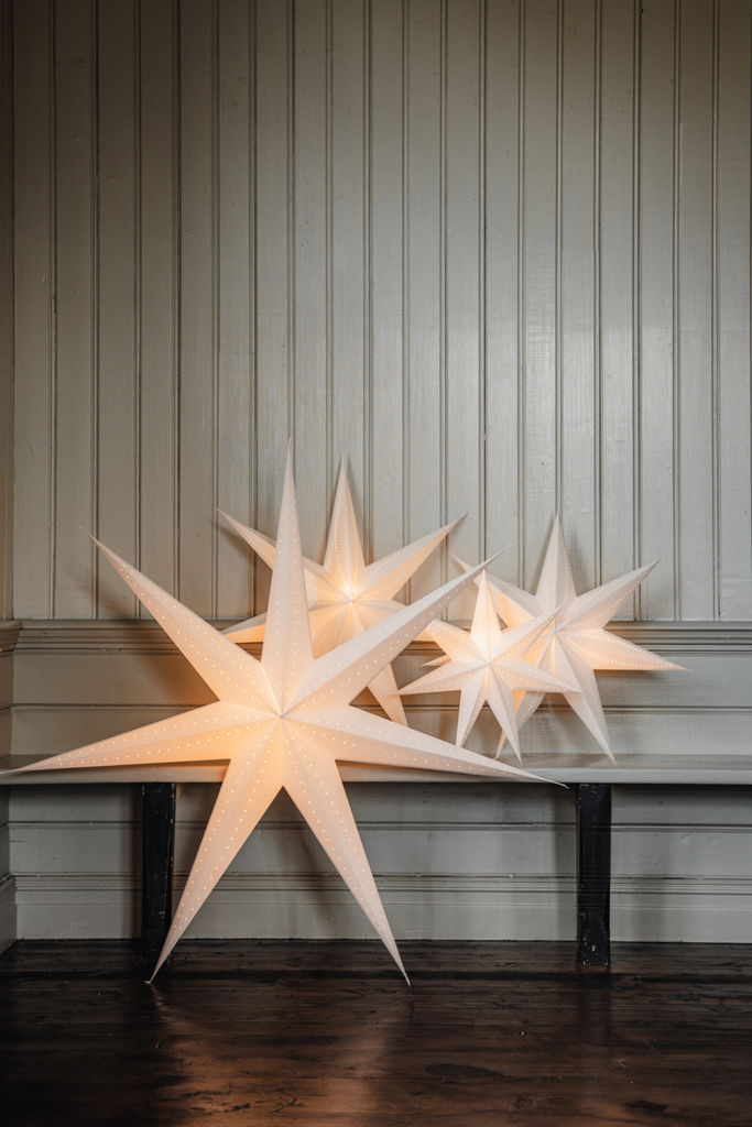 Alde & Linds julstjärnor är omsorgsfullt vikta och limmade för hand för att skapa det perfekta mönstret och ljusspelet till ditt hem. Är tillverkade i Sverige.
