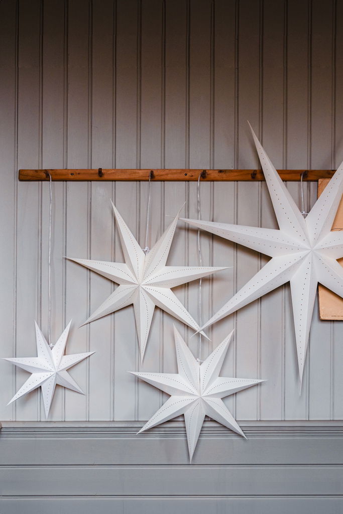En handgjord och klassisk julstjärna i en modern tappning av ett vitt papper med parallella hål av olika storlekar som följs i långa girlanger och ger ett otroligt vackert ljusmönster över hela stjärnan.