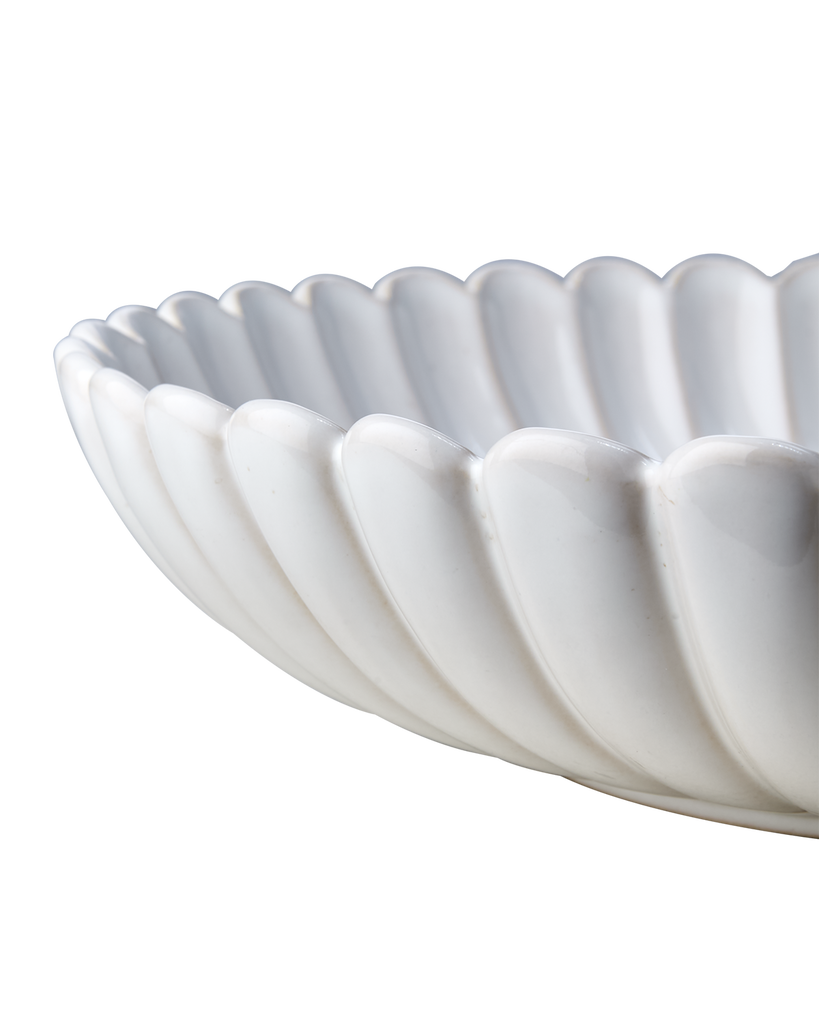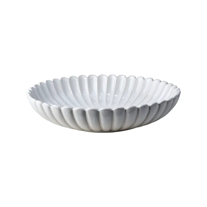 Hulda är ett stort serveringsfat som har en mjukt vågig kant som ger en elegant och naturlig rörelse åt formen. Tillverkat för hand i glaserat stengods i generös storlek som passar för servering av sallader och andra maträtter.