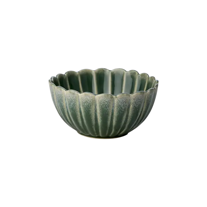 Hulda är en handgjord skål i en grön nyans som utstrålar lugn och balans. Den mjukt vågiga kanten tillsammans med det glaserade stengodset skapar en levande yta och en harmonisk form.