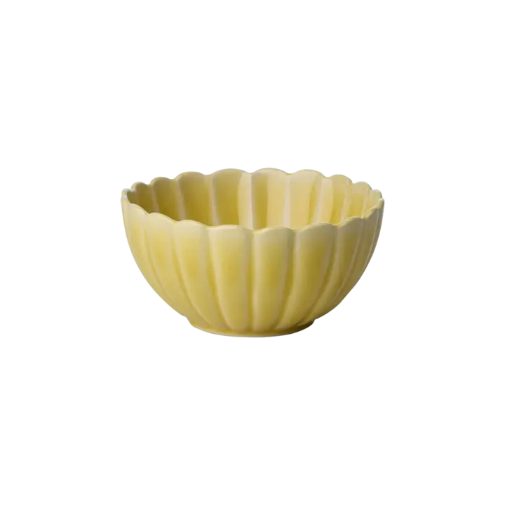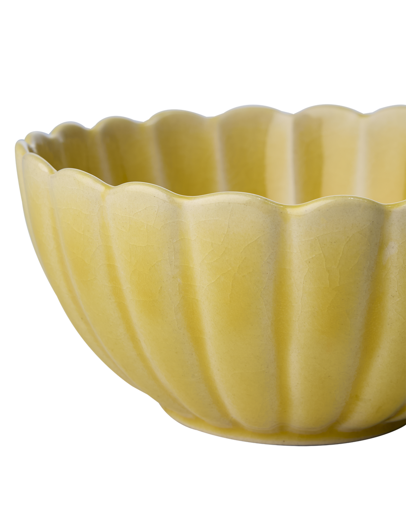 Hulda är en handgjord skål i en gul nyans med en mjukt vågig kant som förmedlar en varm och inbjudande känsla. Perfekt för servering. Säljs i 4-pack.