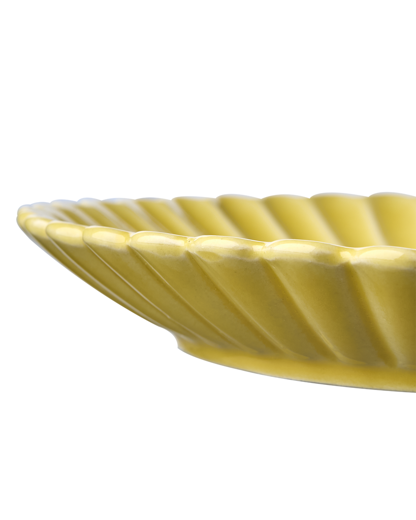 Hulda är en handgjord tallrik i en gul nyans som förmedlar en varm och inbjudande känsla. Den glaserade assietten i stengods har en vågig kant som skapar en elegant form och lyfter varje dukning.