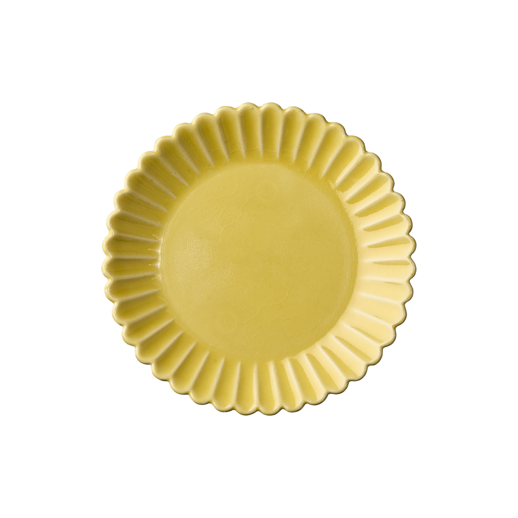 Hulda är en handgjord tallrik i en gul nyans med en mjukt vågig kant förmedlar en varm och inbjudande känsla. Har en diameter på 19cm och säljs i 4-pack.