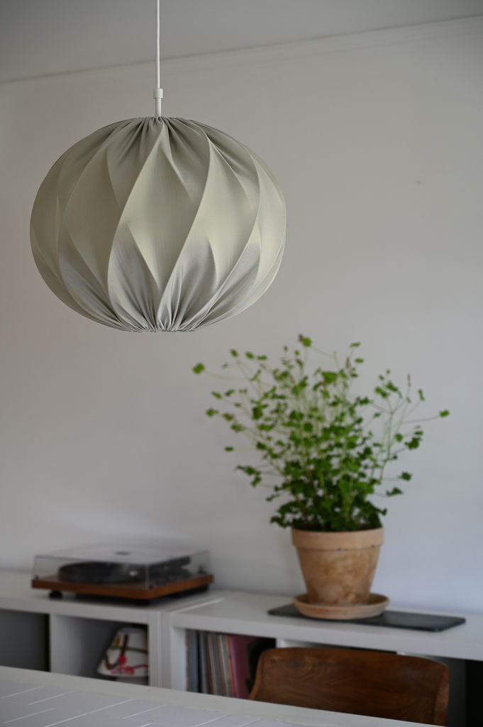 Är tillverkad i ett ganska transparent polyester tyg som ger en kvalité av en mjuk duschess. Passar perfekt som sovrumslampa då den ger ett hemtrevligt och mjukt intryck, men fungerar även för att mjukna upp ett vardagsrum eller kök!