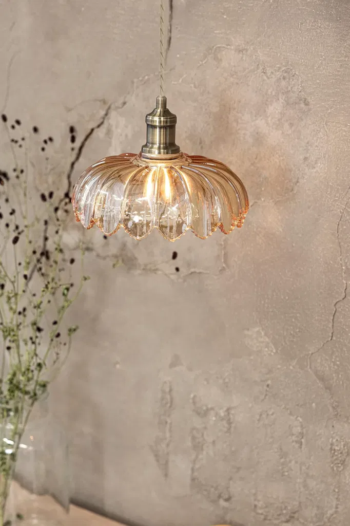 En elegant taklampa i bärnstensfärgat glas med mjuka böljande former är kombinerad med detaljer och takkopp i mässingsfärgad metall. Kurage blir en vacker inredningsdetalj som samtidigt ger ett behagligt allmänljus.