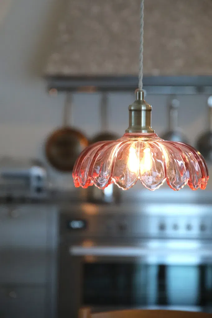 En elegant taklampa i rosa glas med mjuka böljande former är kombinerad med detaljer och takkopp i mässingsfärgad metall. Kurage blir en vacker inredningsdetalj som samtidigt ger ett behagligt allmänljus.