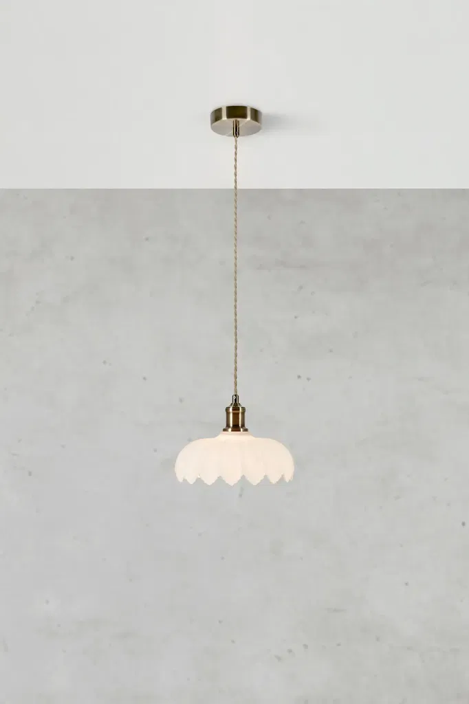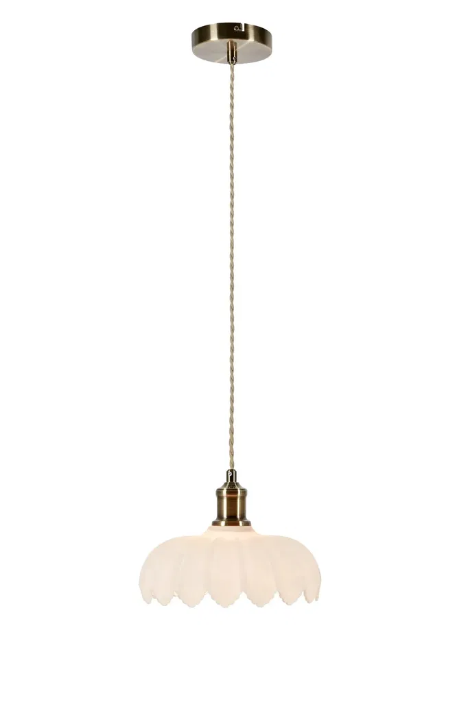 En elegant taklampa i vitt glas med mjuka böljande former är kombinerad med detaljer och takkopp i mässingsfärgad metall.
