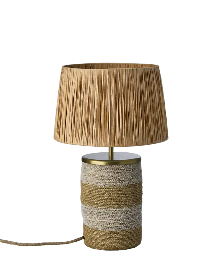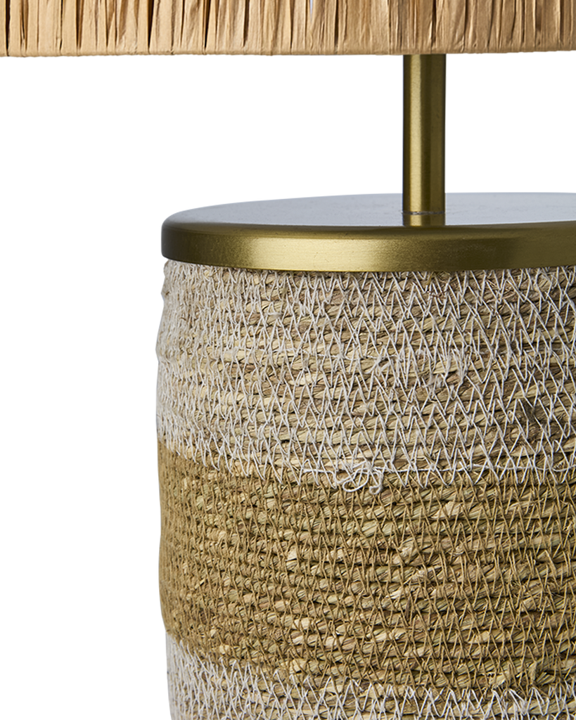 En handtillverkad bordslampa i en bas av mässingsfärgat järn med omslag av Moonjgräs och Raffiagräs i en vit och natur färg.