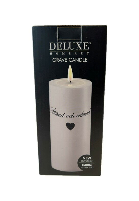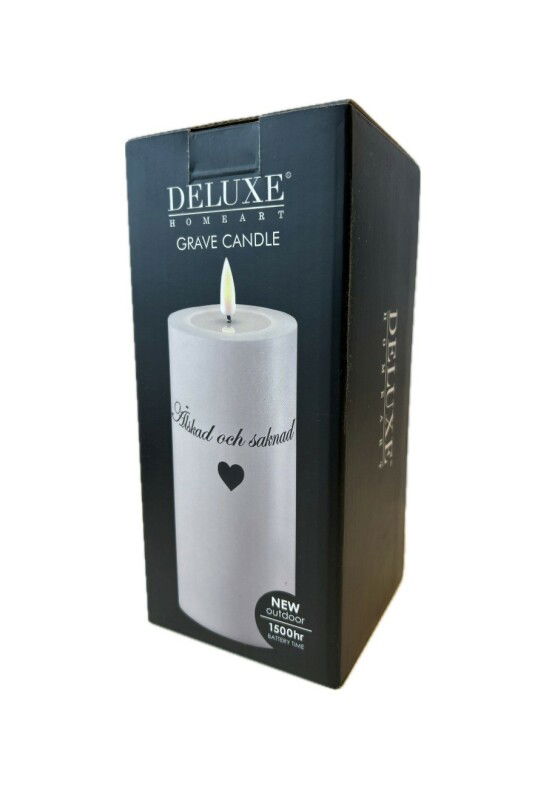 LED gravljus utomhus 7,5x15 Älskad och saknad från Deluxe Homeart. Ett vackert LED-ljus skapat för att ge ett varmt och stämningsfullt sken vid minnesplatser och gravar. Ljuset har texten “Älskad och saknad” tryckt på framsidan tillsammans med ett hjärta – en enkel men stark symbol för omtanke och minne.