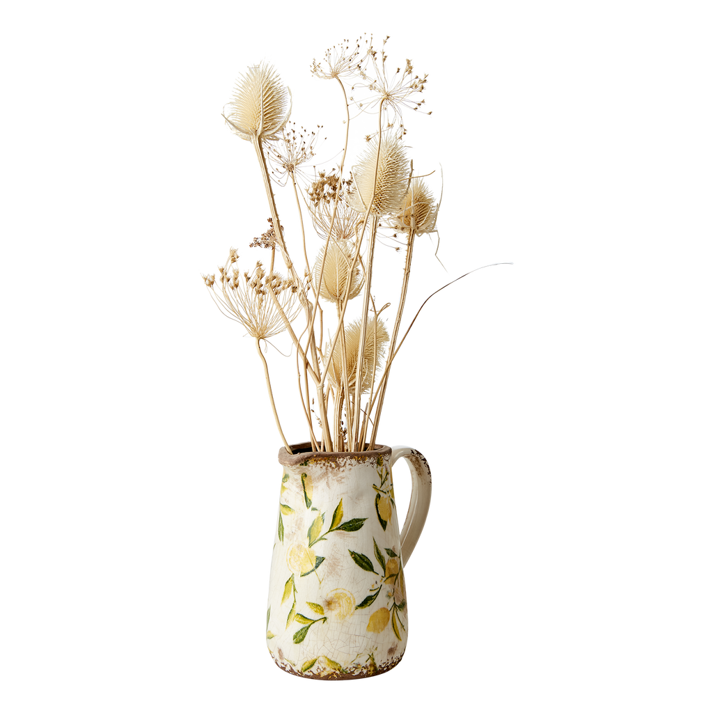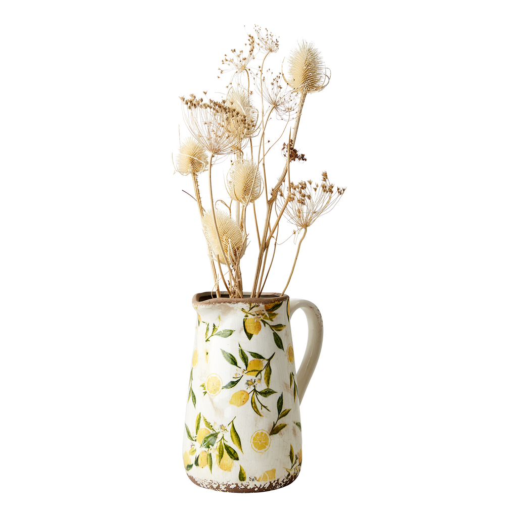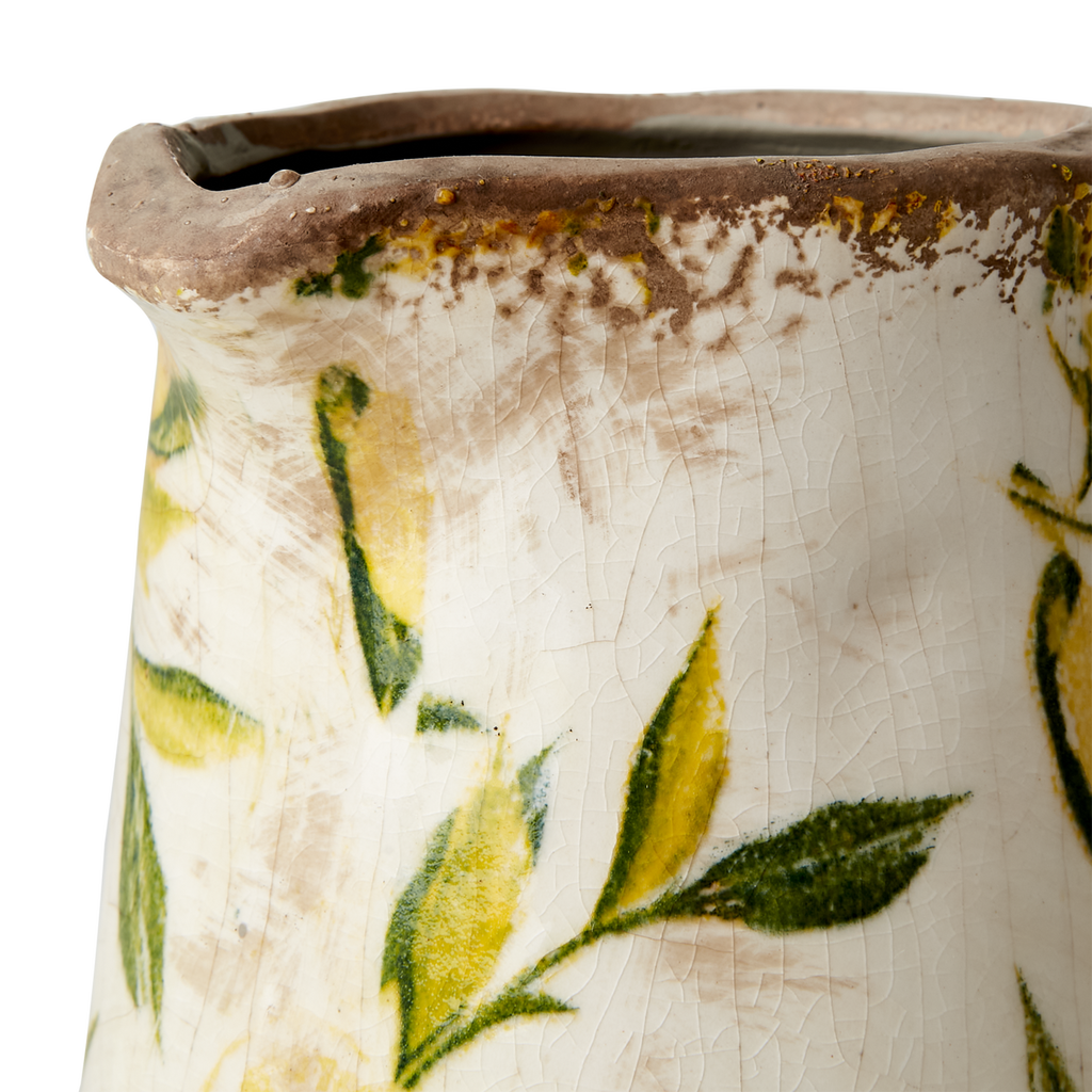 En vacker kanna i sten med en vit bakgrund och ett gult/grönt citron motiv. Lemona gör sig fin på middagsbordet med vatten i men även som en inredningsdekoration som den är eller med blommor och växter i.