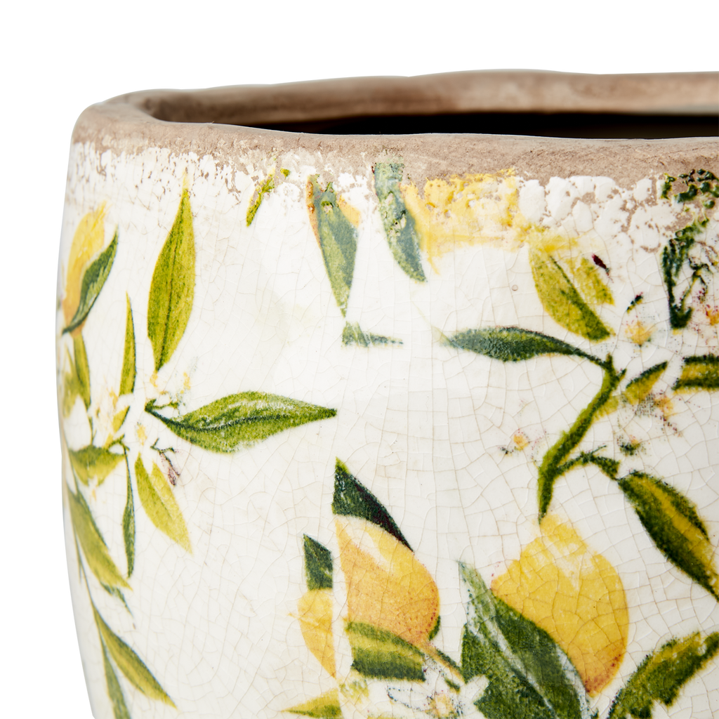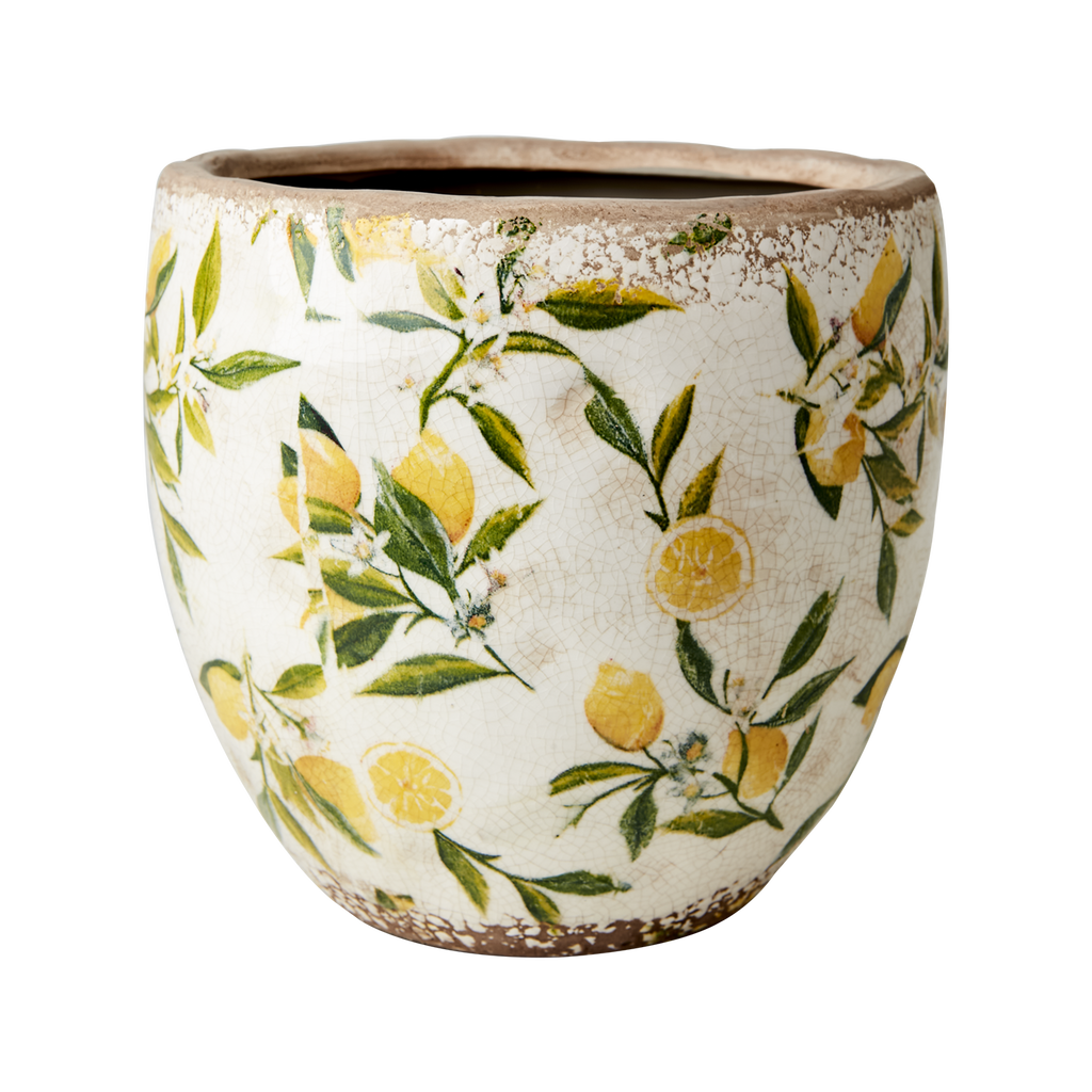 En vacker kruka i sten med en vit bakgrund och ett grön/gult citron motiv. Lemona är vattentät och gör sig fin inomhus som utomhus. Låt den bli en del av inredningen som den är eller matcha med växter och blommor.