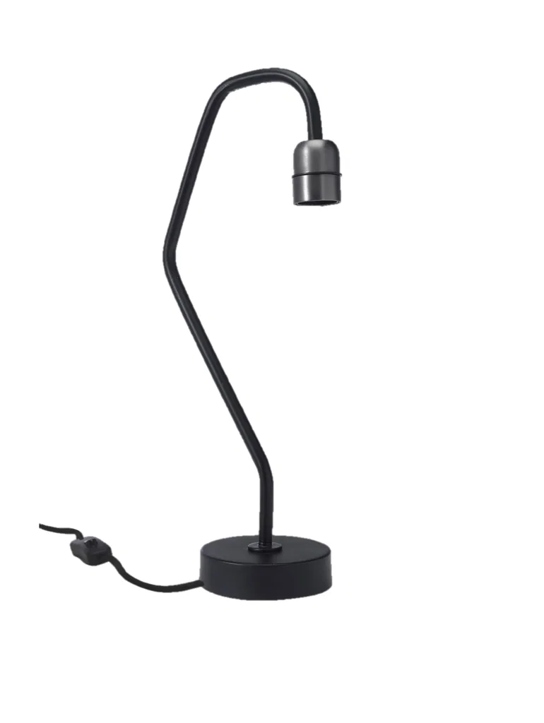 En minimalistisk lampfot med industriell känsla som är tillverkad i svart metall med lamphållare i mörkgrå finish. Lampan kan användas med en dekorativ ljuskälla eller med en toppmonterad lampskärm för E27 (max 22 cm i diameter / höjd 10–12 cm).