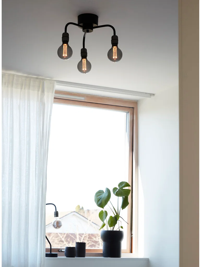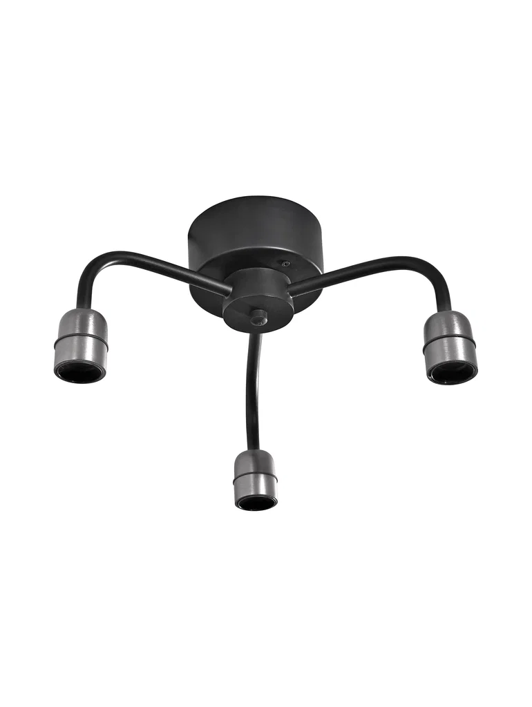 En minimalistisk plafond med industriell känsla som är tillverkad i svart metall med 3 stycken lamphållare i mörkgrå finish. Lampan kan användas med dekorativa ljuskällor eller med toppmonterade lampskärmar för E27.