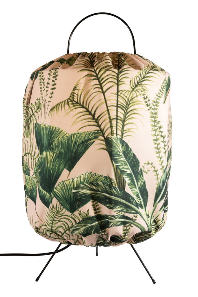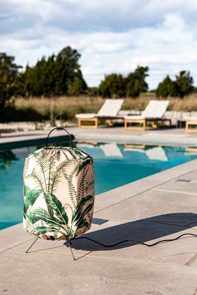 Lampan är tillverkad av väderbeständiga material där tyget är smuts/vatten avvisande, UV-beständigt och har hög färgfasthet vilket betyder att det står emot starkt soljus och kommer inte att blekas av att stå utomhus.