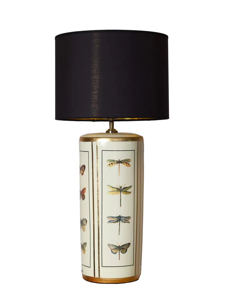 Lampfot i keramik i en mjuk gul nyans som är prydd med handmålade, pastellfärgade fjärilar med skimrande gulddetaljer. Är kombinerad med en svart lampskärm med guldig insida.
