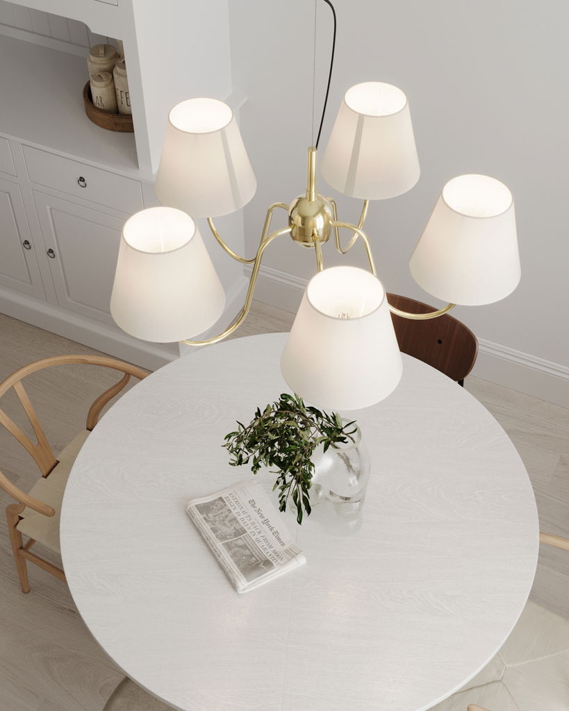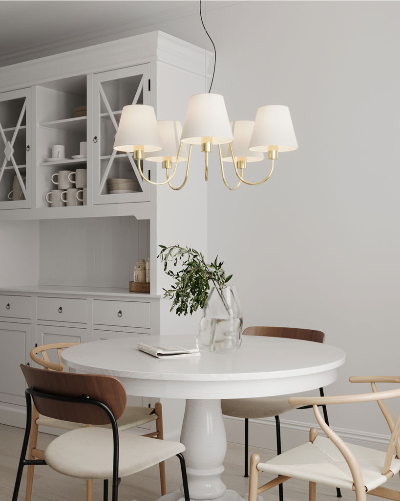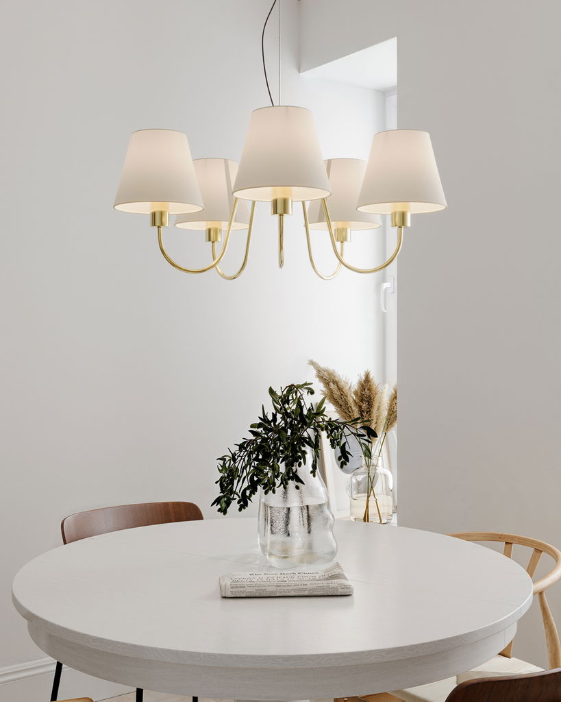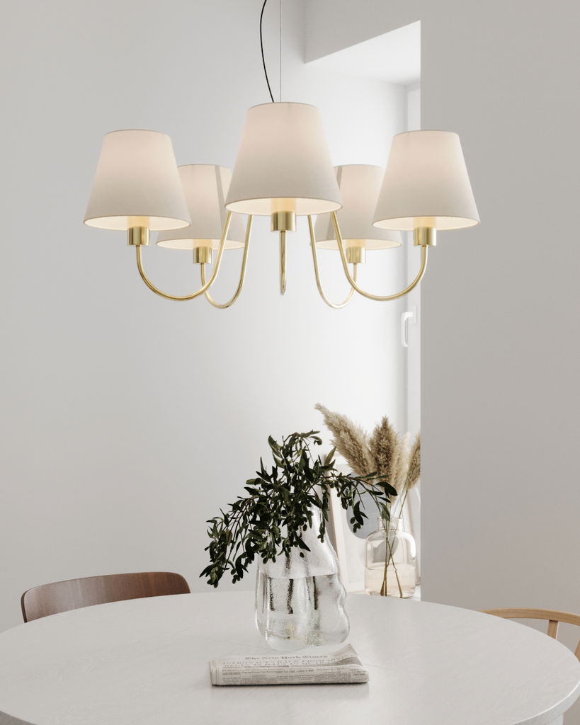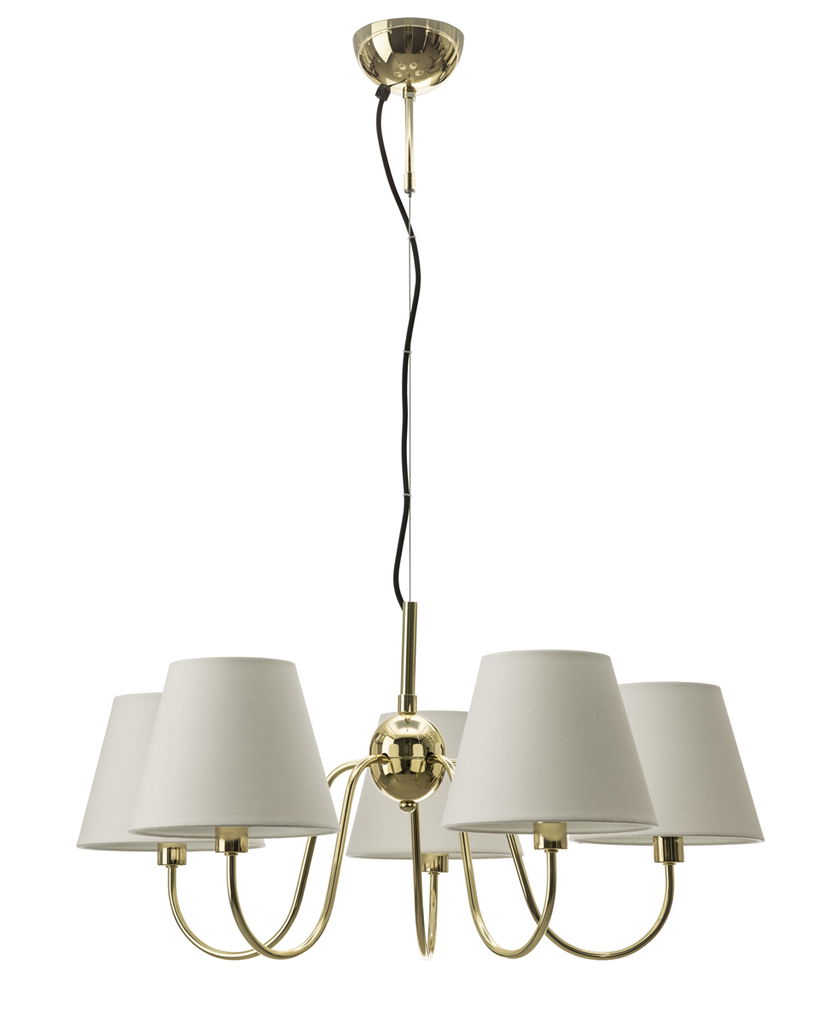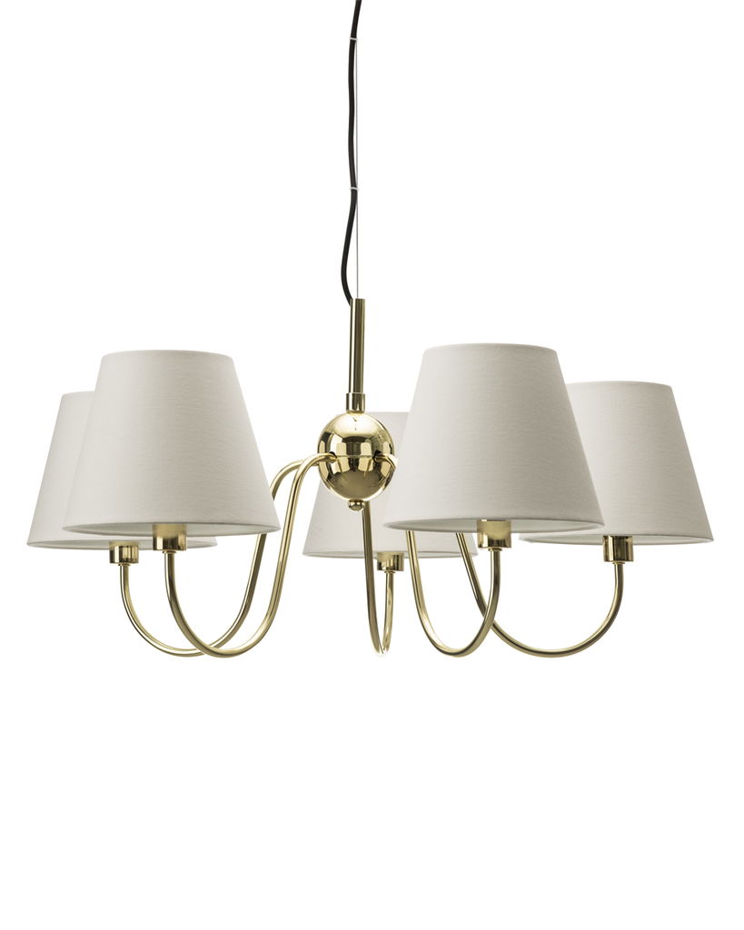 En klassisk och tidlös taklampa i mässingsfärgad metall som har 5st mjukt böjda armar som är kombinerad med vita lampettskärmar. Lynx skapar en varm och inbjudande atmosfär i rummet och sprider ett behagligt ljus genom de textila skärmarna.