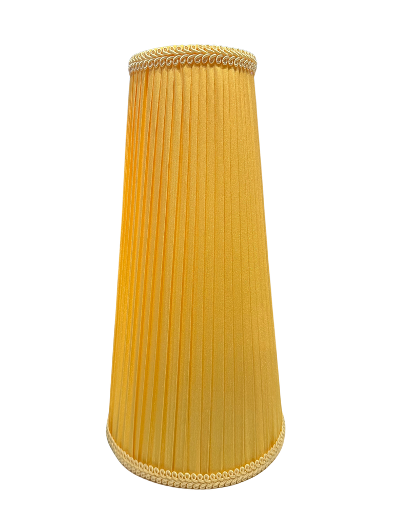 Margareta Stilskärm Avlång 14 Gul från Hallbergs Belysning är en vacker och harmonisk lampskärm i plisserat satin tyg. Har ett matchande kantband i ett vackert mönster och med en unik avlång form.