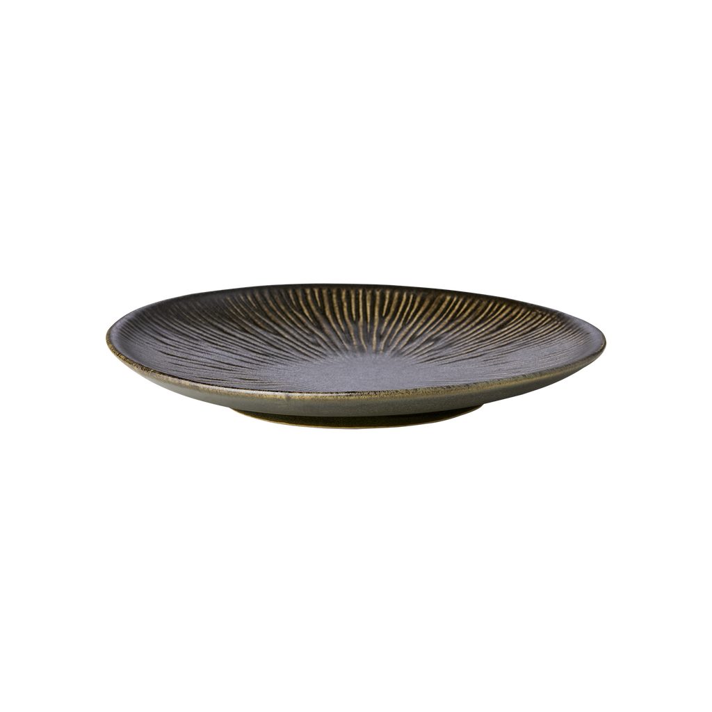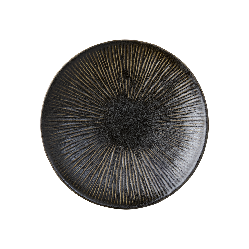 En elegant tallrik i stengods med en djup, jordnära mörkbrun ton som ger dukningen karaktär och värme. Den robusta och matta ytan skapar en rustik men samtidigt sofistikerad känsla, perfekt för både vardagsmiddagar och mer festliga tillfällen.
