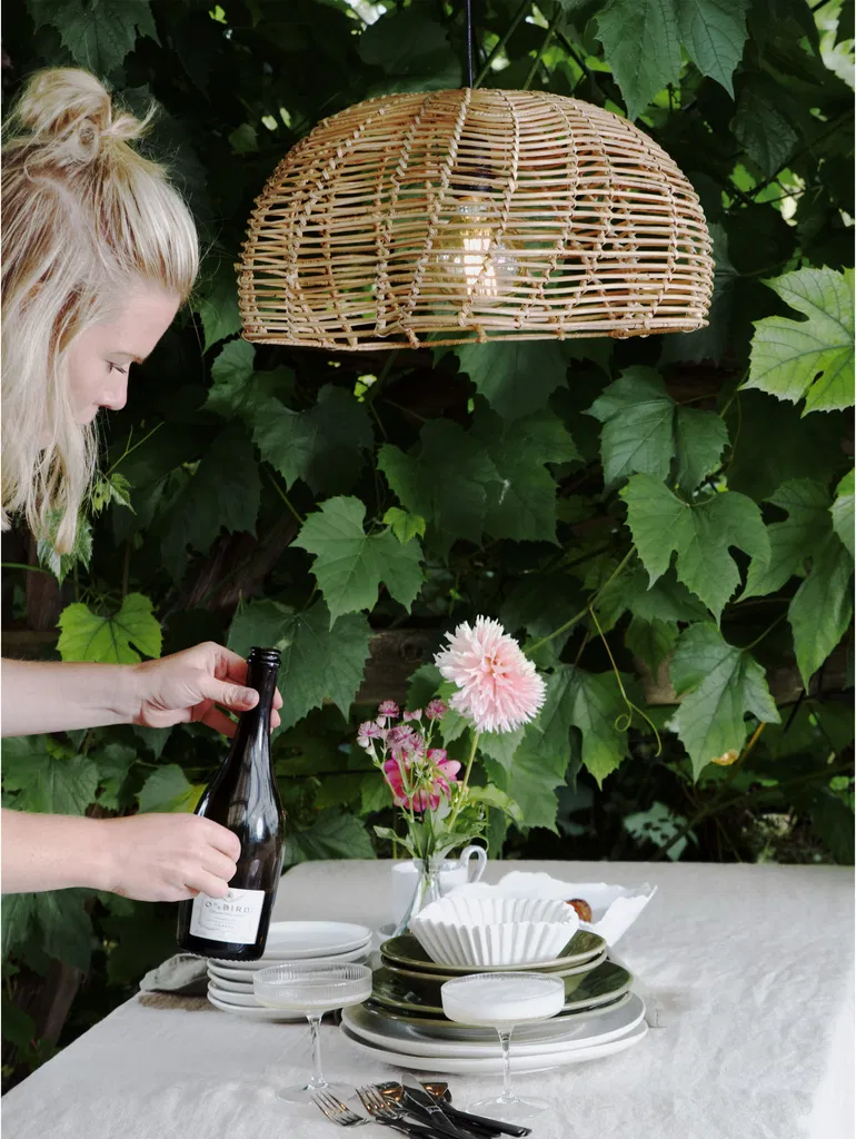 En handvävd taklampa i naturlig rotting, som skapar en varm och inbjudande atmosfär i din utomhusmiljö. Den formade nyansen är gjord av noggrant sammanflätade rattantrådar, vilket ger varje del sin egen unika karaktär.