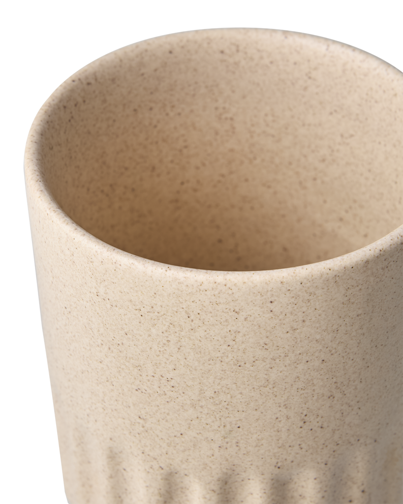 En rymlig kopp i stengods med mjuka, naturliga toner. Den räfflade basen ger en taktil och dekorativ känsla, samtidigt som den skapar ett bra grepp.
