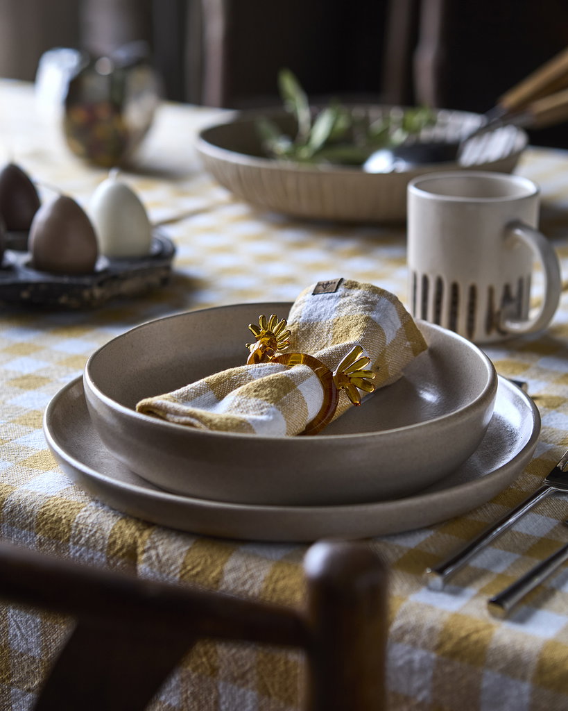En rymlig kopp i stengods med mjuka, naturliga toner. Den räfflade basen ger en taktil och dekorativ känsla, samtidigt som den skapar ett bra grepp.