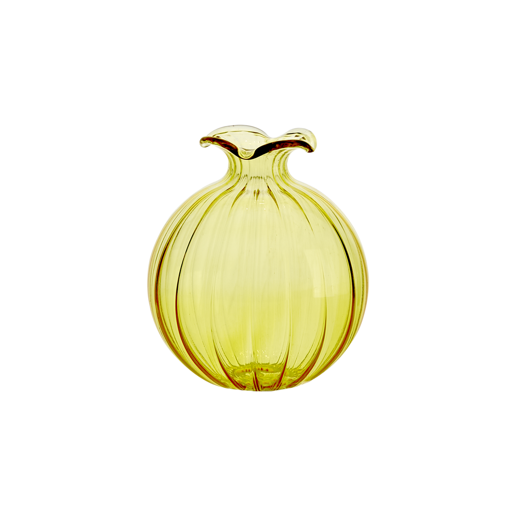 En vacker, mindre vas i gult glas som blir en fin dekoration under vår- och sommartider. Gör sig fin som en färgklick till inredningen som den är, eller i kombination med blommor.