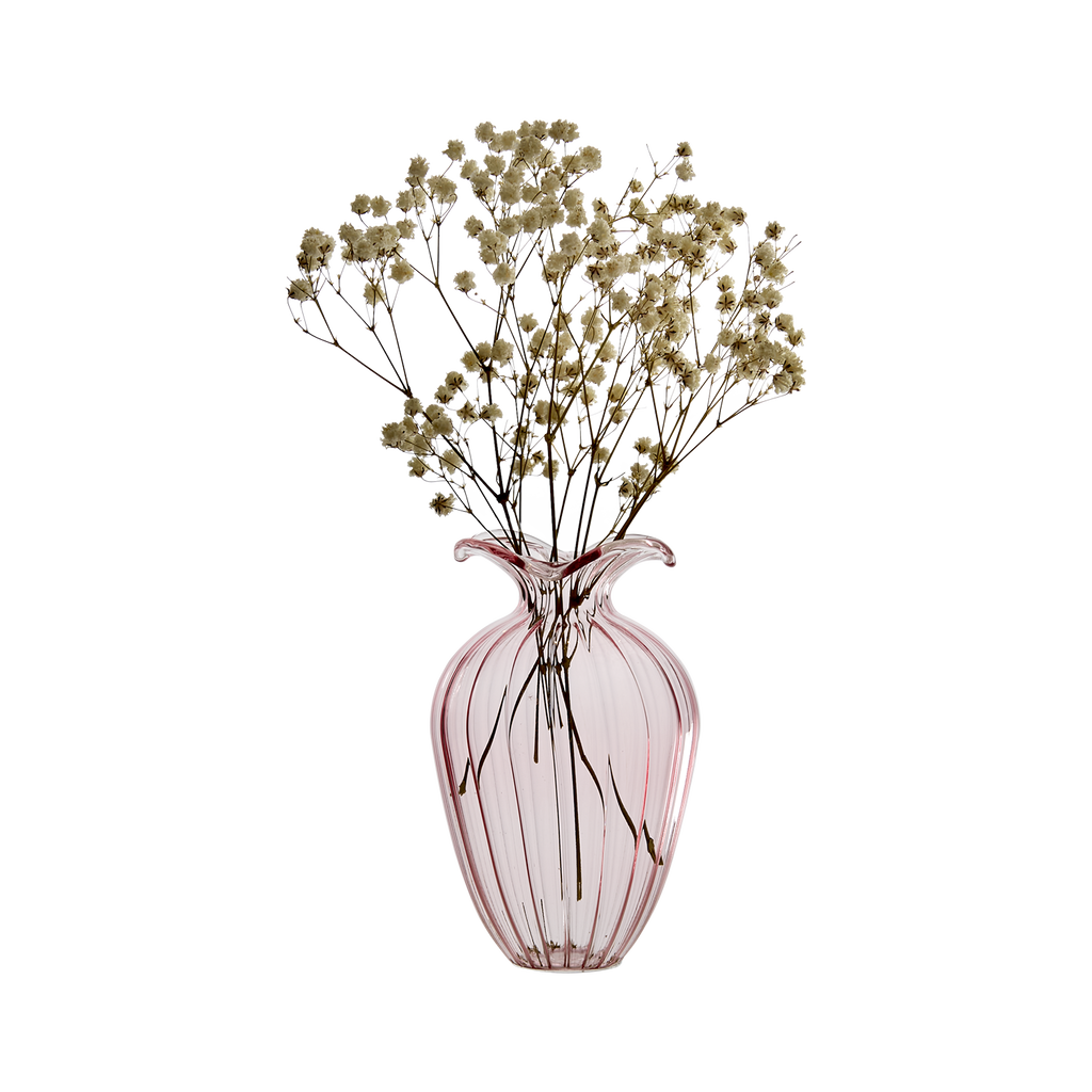 En vacker, mindre vas i rosa glas som blir en fin dekoration under vår- och sommartider. Gör sig fin som en färgklick till inredningen som den är, eller i kombination med blommor.