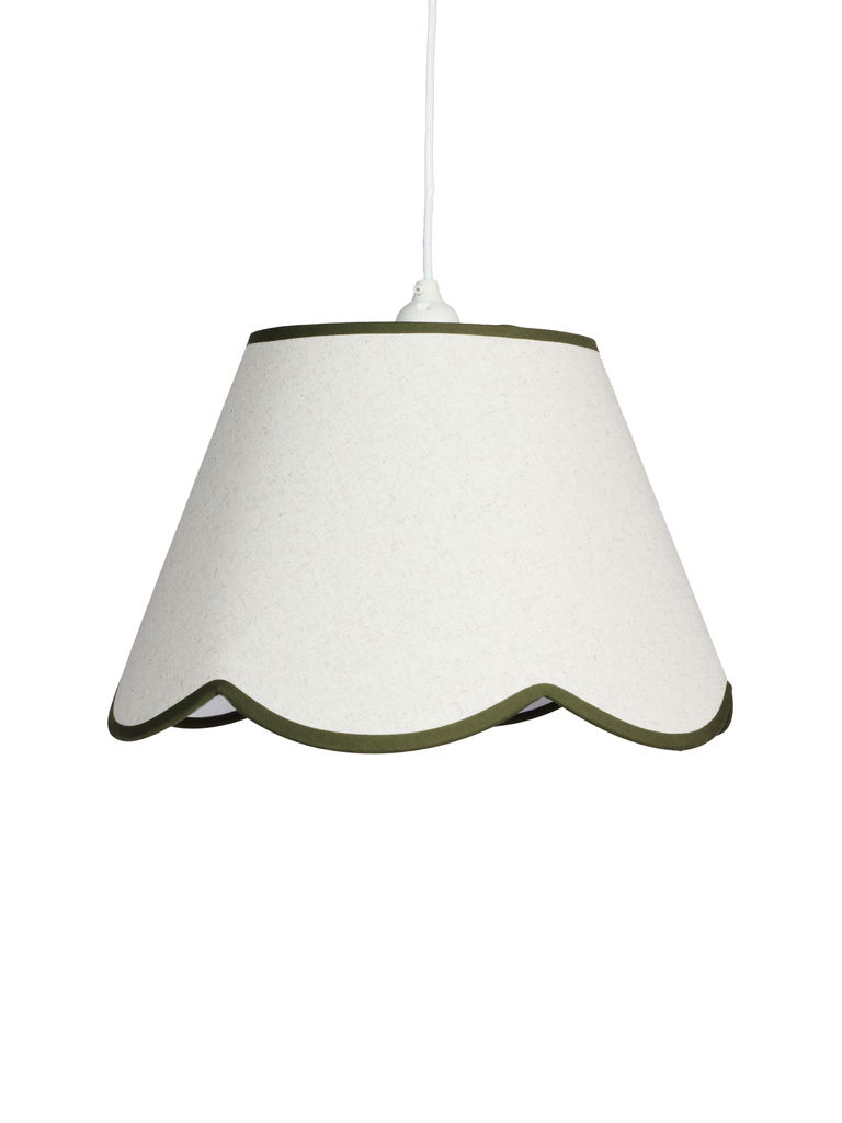 En vacker lampskärm i linnetyg med en vågig kant nedtill och har kantband i en mossgrön färg. Kommer med ett vitt sladdställ på 1,2m. Gör sig fin ovanför ett köksbord eller vardagsrumsbord.