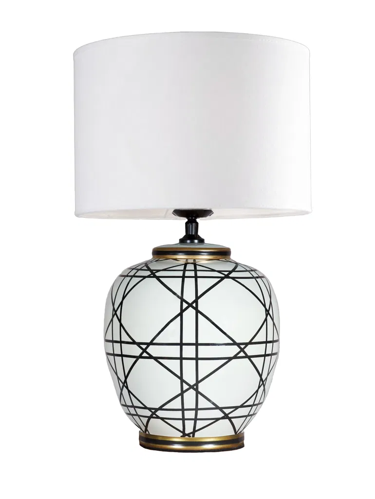New york lampfot kombinerad med lampskärm. Lampfoten har en urnform tillverkad i keramik i en vit färg med ett svart grafiskt mönster, som är kombinerad med en vit lampskärm i en cylindrisk formgivning.