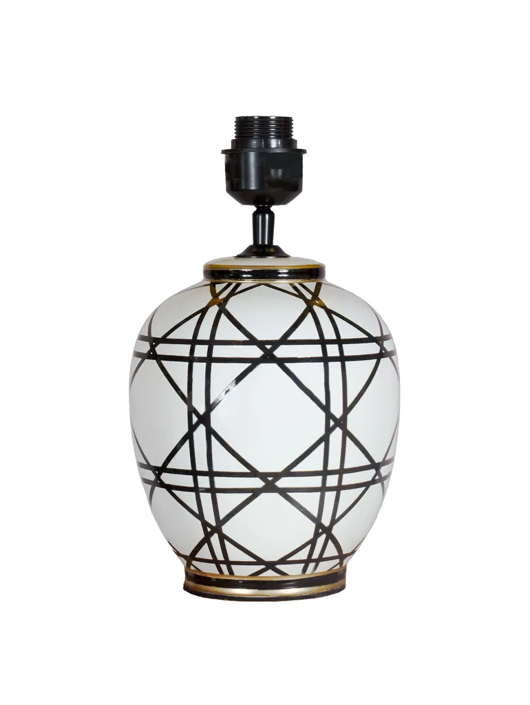 En elegant bordsarmatur i keramik som är en perfekt kombination av grafisk design med en klassisk form som lyfter varje rum. Har en urnform i en vit färg med ett svart grafiskt mönster