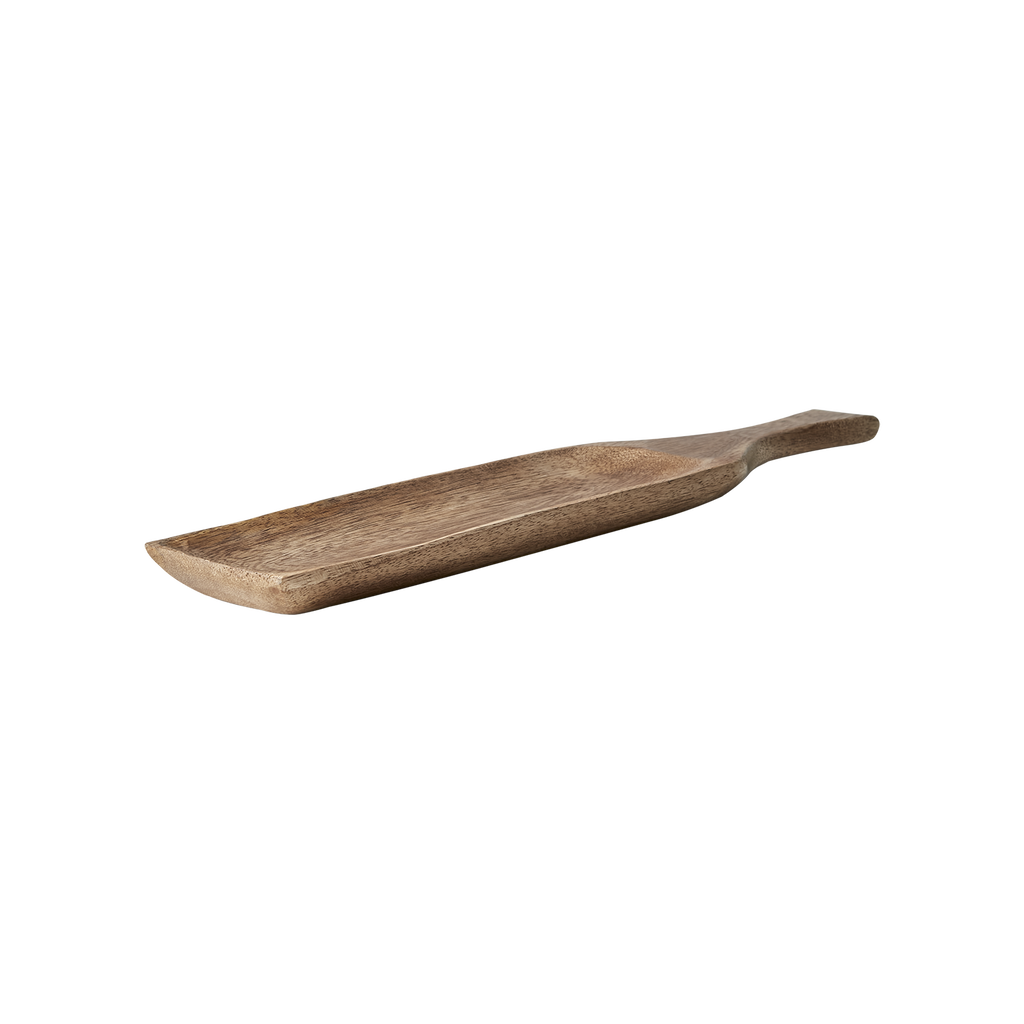 Ett avlångt och nätt fat i mangoträ i en naturfärg som ger ett elegant intryck. Karaktären i träet lyfts fram med den varma och naturliga tonen och varje exemplar bär sin unika ådring.