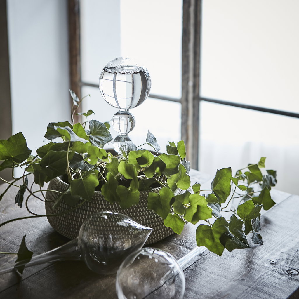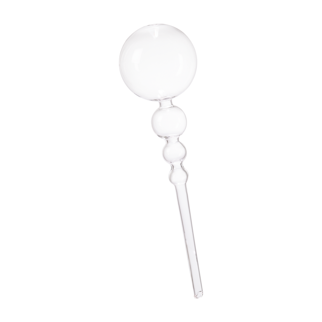 Rund bevattningskula av munblåst klart glas. Fyll glasbubblan med vatten och stick ner pipen direkt i blomkrukan så har du en lika vacker som praktisk självbevattnare för dina växter.