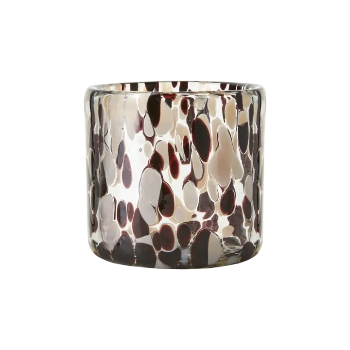 En vacker värmeljushållare i en rak och klassisk formgivning, tillverkat i munblåst glas i en brun/beige/svart färg. Gör sig fin i alla miljöer.