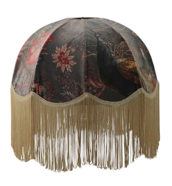 En häftig och lyxig lampskärm där lampskärmen har ett diskret och mönstrat tyg av påfåglar och blommor, med en grå bakgrund som är matchad med guldiga fransar. Kombinera med upphänge för att få en taklampa. Välj mellan två storlekar.
