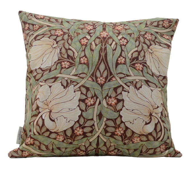 Pimpernel kuddfodral är inspirerade av det ikoniska mönstret från William Morris, en pionjär inom den brittiska Arts and Crafts-rörelsen. Mönstret kännetecknas av täta, symmetriska växtmotiv med slingrande blad och blommor i djupa, harmoniska färgskalor.