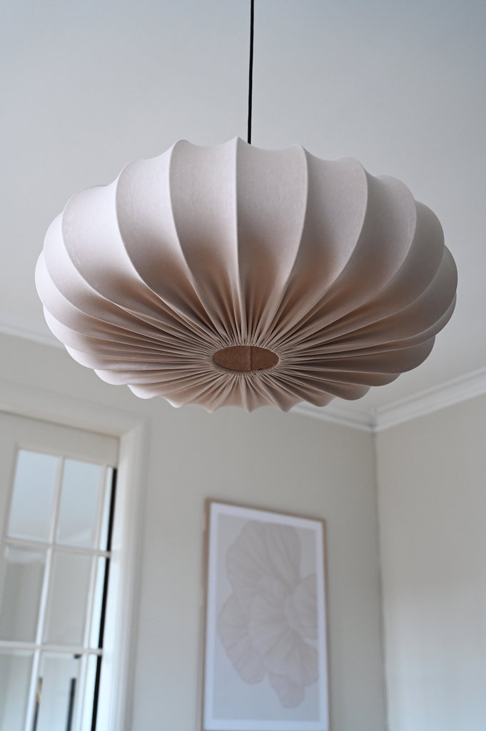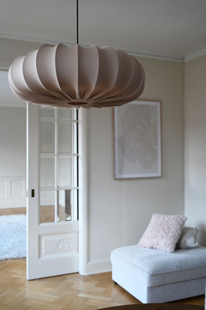 Har en mjuk formgivning och tillverkad i sandfärgad bomullstrikå. Ger ifrån sig en mysig mängd belysning och blir en trevlig detalj i taket. Välj mellan två olika storlekar.