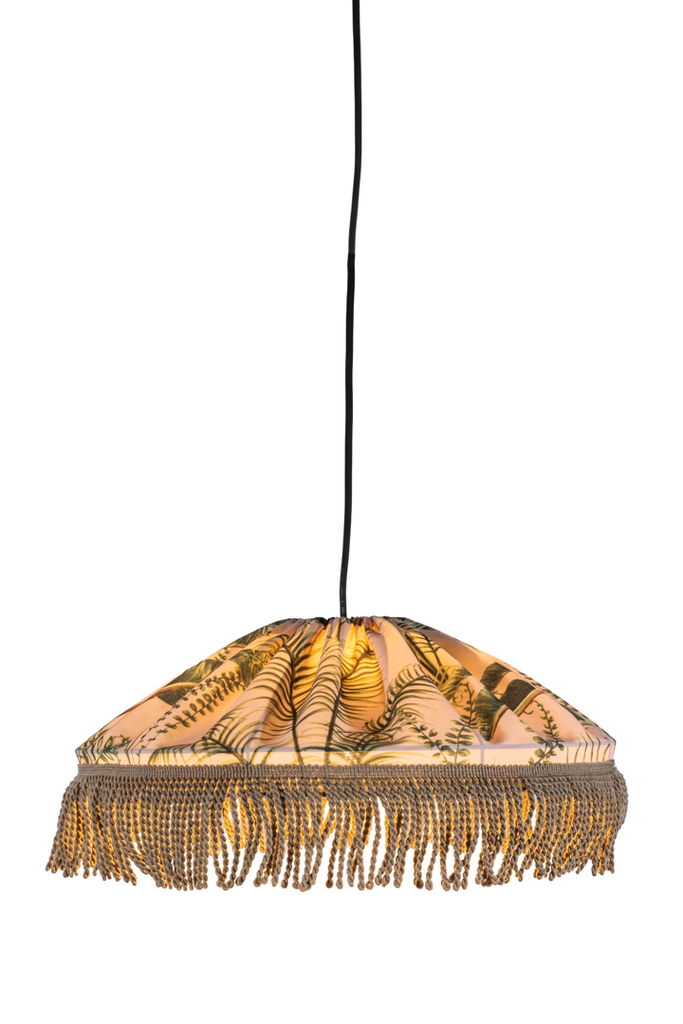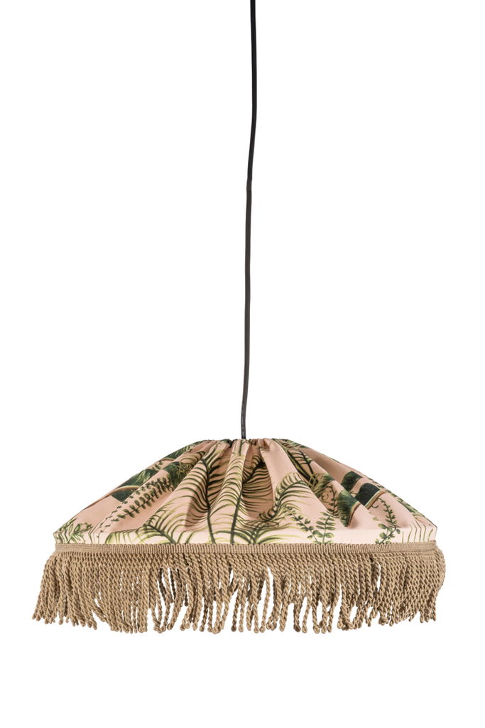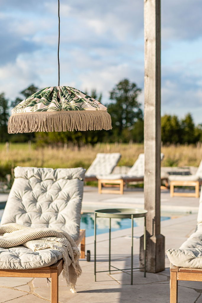 En elegant taklampa som skapar en inbjudande atmosfär på uteplatsen. Är tillverkad av väderbeständiga material där både tyg och frans är vattenavvisande och UV-beständiga.