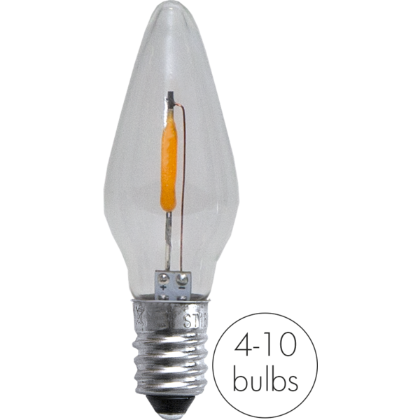 Utförd i klart glas och har E10-sockel. Produkten passar till 4-10 armade ljusstakar. Volt: 23-55V Effekt: 0,1 - 0,5W Sockel: E10 Lamptyp: LED