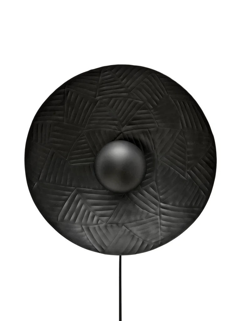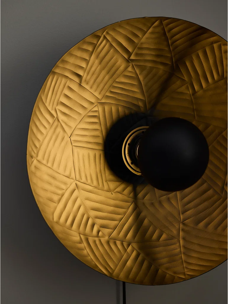 En häftig vägglampa i matt svart metall med ett hamrat dekorativt mönster. Blir en modern inredningsdetalj på väggen och metallen skimrar i guld med en varm ljuskälla.