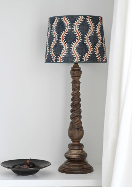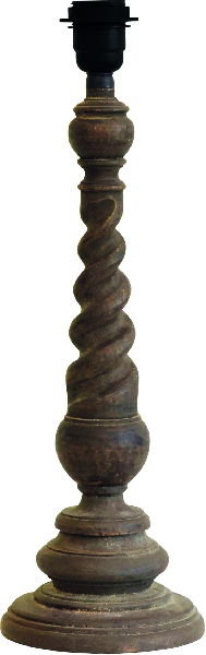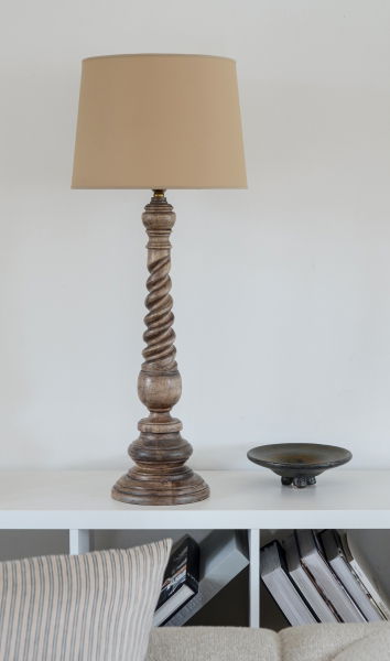 Elegant bordslampa i åldrad träfinish med dekorativ fot och två storlekar. Perfekt för att tillföra stil och värme till alla rum.