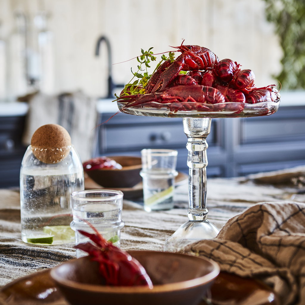 Ett elegant och tidlöst uppläggningsfat som förhöjer presentationen av kakor, bakverk och små aptitretare. Den vågiga kanten och det klara glaset skapar en luftig och dekorativ känsla som lyfter både festliga och vardagliga dukningar.