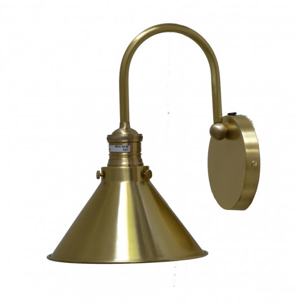 En vacker vägglampa med en mjukt formad stomme som är kombinerad med en skomakarskärm i mässingsfärgad metall.