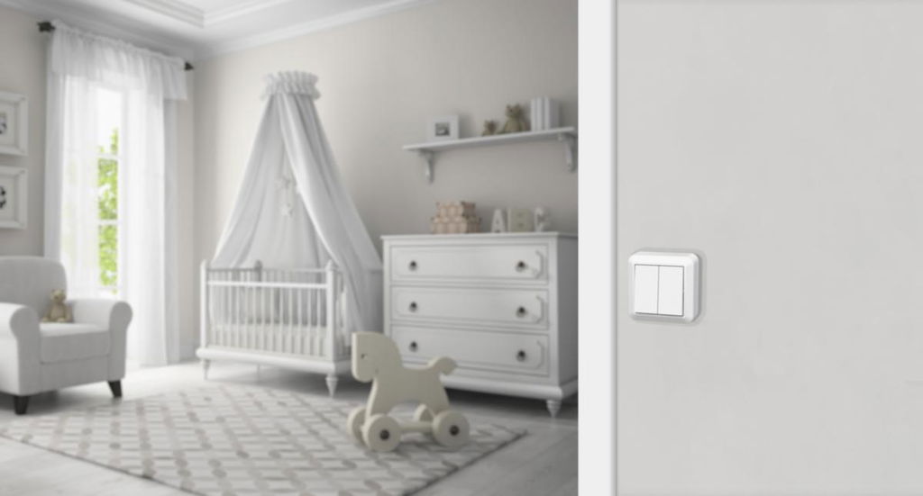 Strömbrytare Utanpåliggande kron, Connect 2 Home, från Gelia. Strömbrytaren levereras inklusive impulsfjäder. När strömbrytaren ska användas tillsammans med en dosdimmer/dimmerpuck behöver impulsfjädern monteras för att få en återfjädrande funktion på vippan. Endast en vippa kan användas med impulsfjäder på brytare med fler vippor.