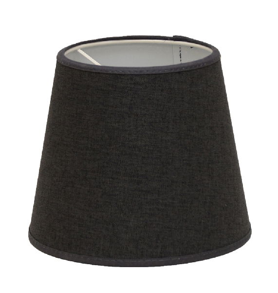 En stilren lampskärm i ett svart linnetyg som har en rund formgivning.