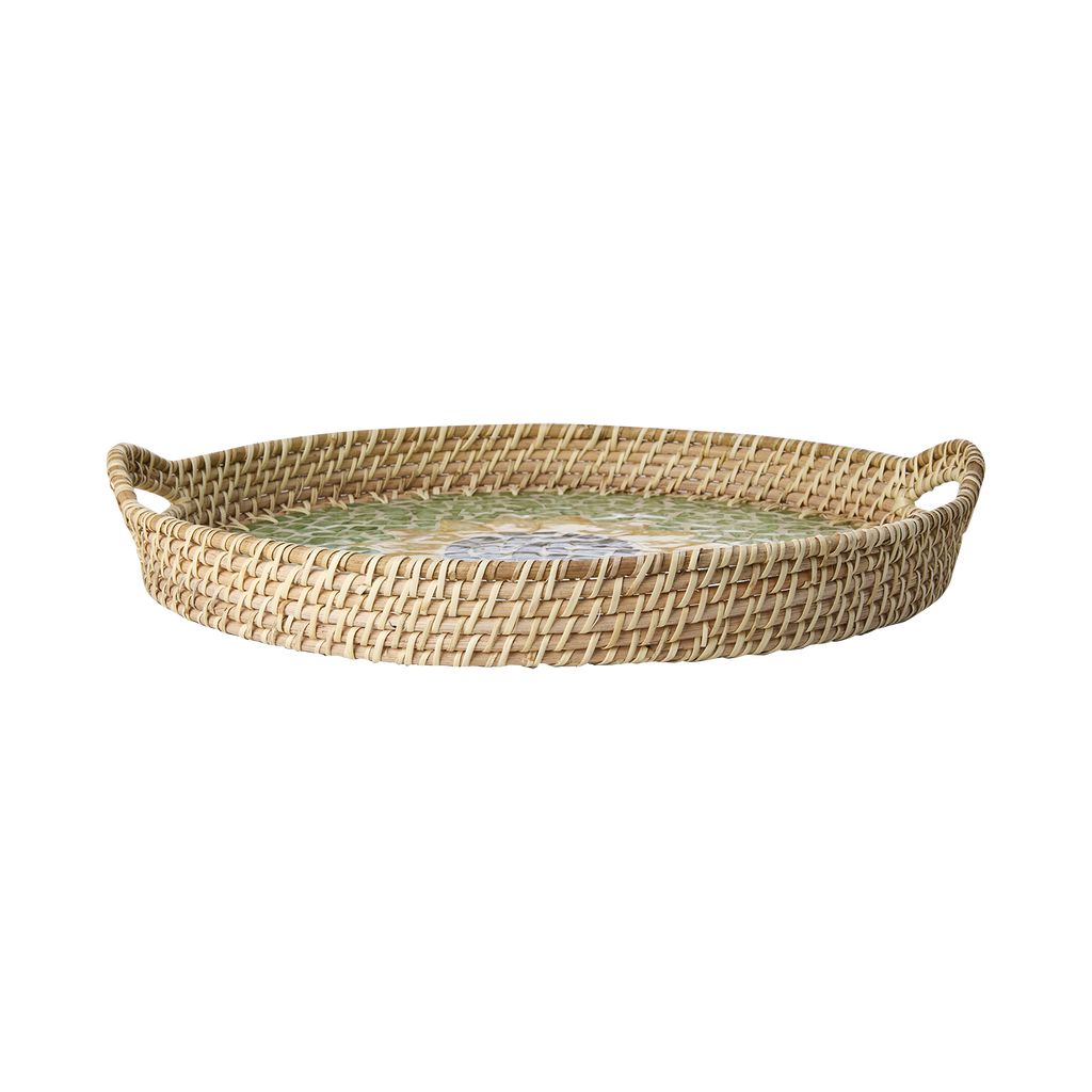 Sunny bricka i grönt/natur är en vacker, handtillverkad serveringsbricka som kombinerar naturliga material med en frisk grön ton. Mönstret är omsorgsfullt lagt av odlade snäckor och är kombinerad med en kant i flätad rotting.