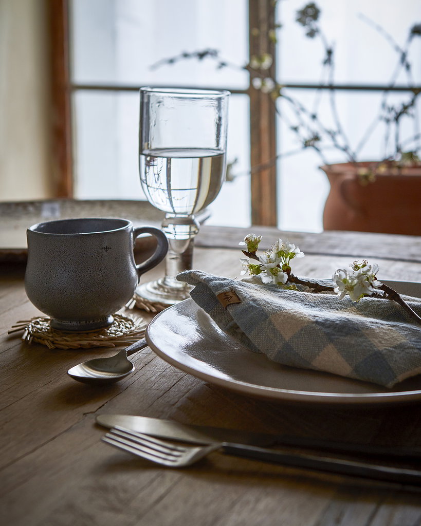 Ett elegant och funktionellt glasunderlägg tillverkat i sjögräs, format som en sol, skyddar bordet mot ringar och spill. Skapar en varm, naturlig känsla i dukningen.