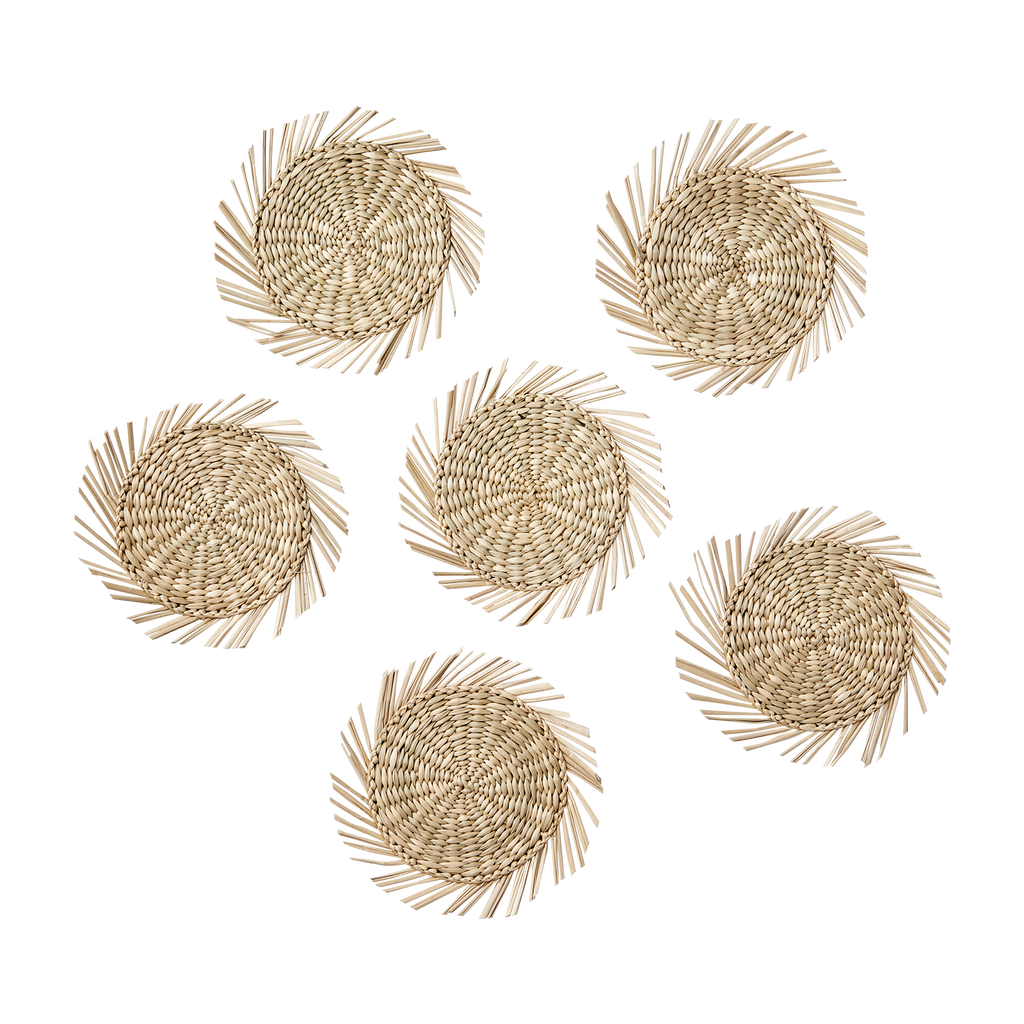 Ett elegant och funktionellt glasunderlägg tillverkat i sjögräs, format som en sol. Den naturliga strukturen ger en varm och organisk känsla som passar perfekt i både moderna och klassiska dukningar.