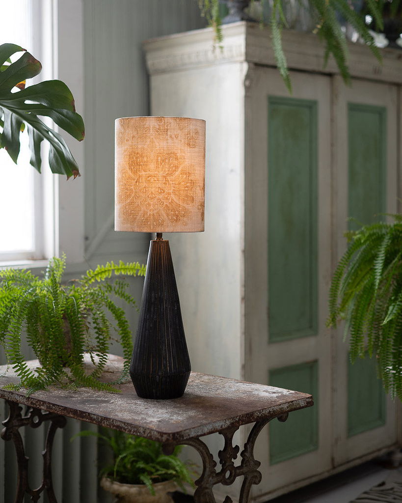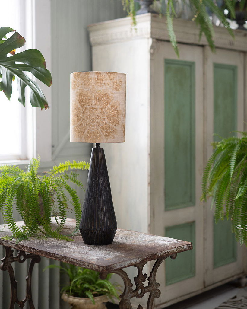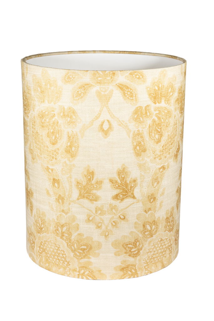En handsydd lampskärm tillverkad i ett linnetyg med ett vackert honungsgult mönster, med fina invikta kanter. Har en cylinder form som gör sig fin i i många olika inredningsstilar. Välj mellan två storlekar.