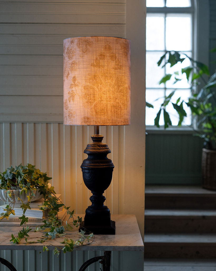 En handsydd lampskärm tillverkad i ett linnetyg med ett vackert honungsgult mönster, med fina invikta kanter. Har en cylinder form som gör sig fin i i många olika inredningsstilar, de kan smälta in både i retrostilen och i mer modernt inredda rum.