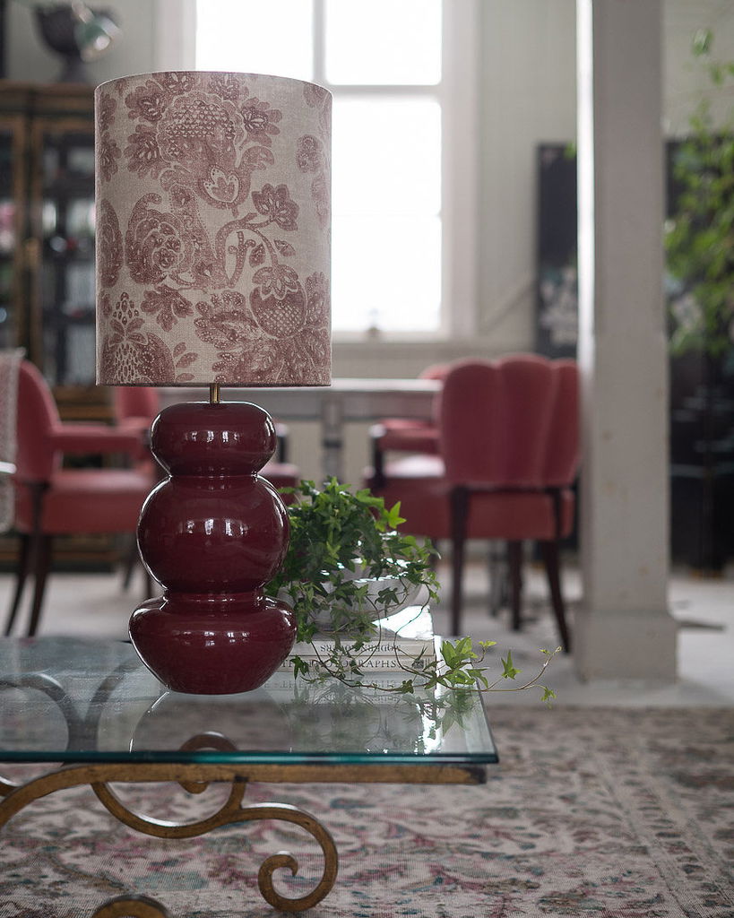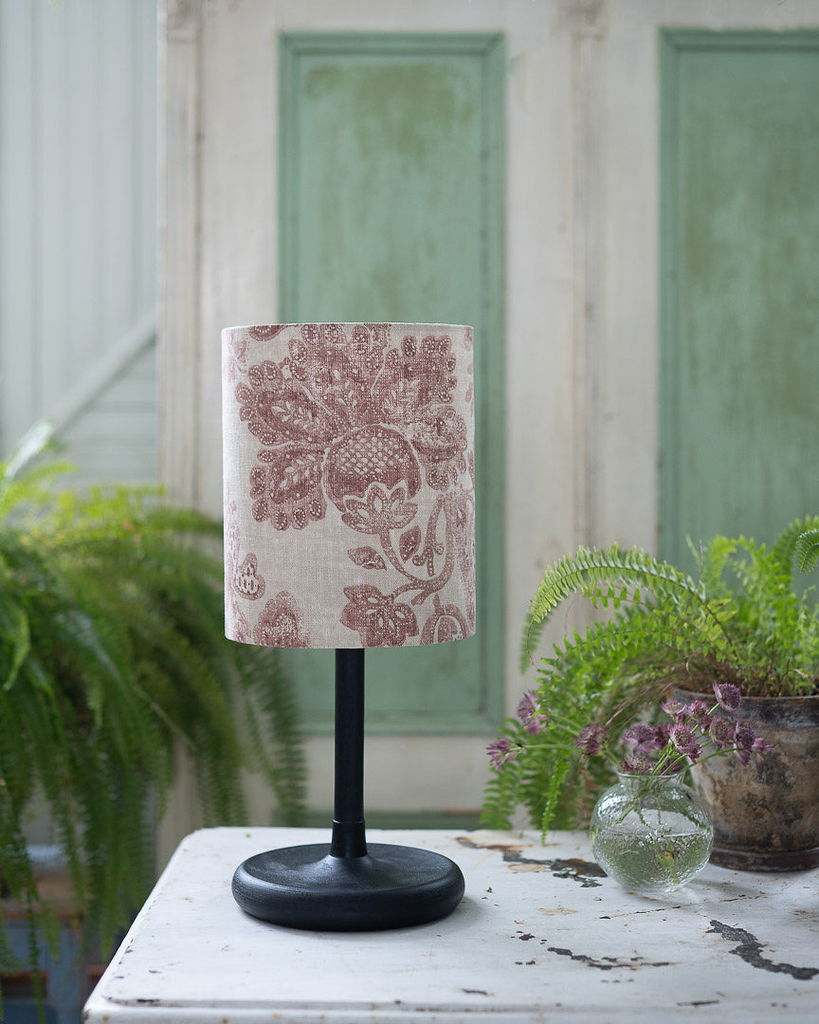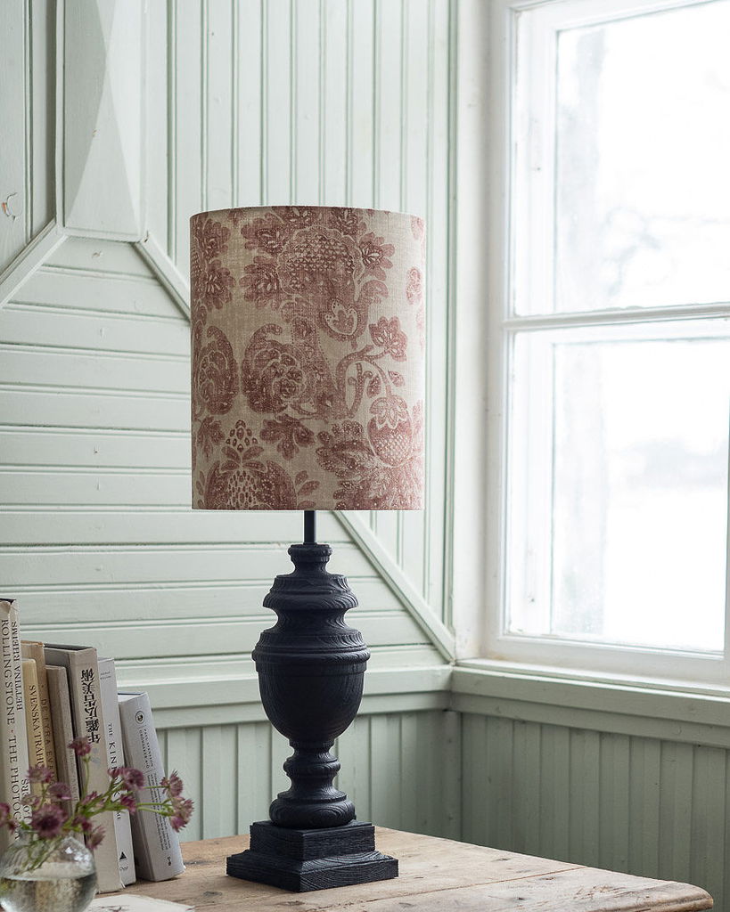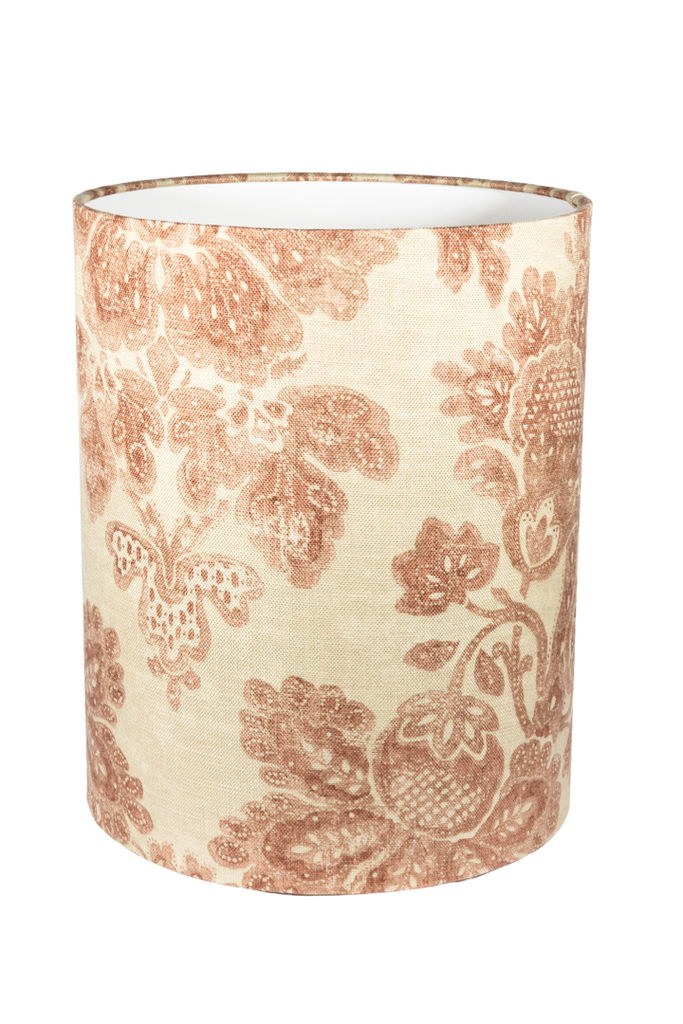 En handsydd lampskärm tillverkad i ett linnetyg med ett vackert vinrött mönster, med fina invikta kanter. Har en cylinder form som gör sig fin i i många olika inredningsstilar. Välj mellan två storlekar.